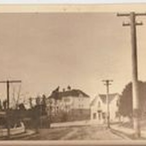 Photo--black and white: Bodega Avenue in Sebastopol looking west with the Sebastopol Grammar School in the center background. Present location of Park Side school.