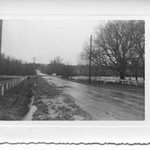 Print--black and white: 1951 flood in the Sebastopol Laguna area. Floodwaters are seen in the distance covering the road.