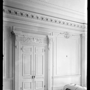 View of the interior of the residence during construction. The door and crown molding have been installed, but the floor is unfinished and fixtures are lacking. MS note on verso reads "HEH residence interior."