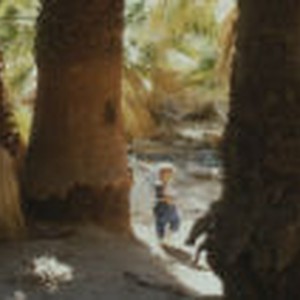 A young boy named David walking by tree trunks at Cottonwood Springs, Joshua Tree.