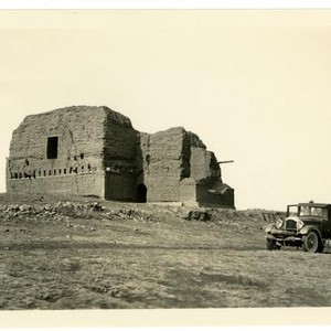 A car is parked in front of the ruins of a stone house in the American West