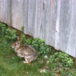 A rabbit sitting on the grass next to a wooden fence near the peaks of Otter Visitor Center, mile marker 86 of the Blue Ridge Parkway.