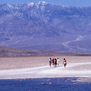 Slide shows a group of people walking on the salt flats at Badwater Basin. Mountains are visible in the background. Badwater Basin is the lowest point in North America at 282 feet below sea level. Scanned with Epson Perfection V700 Photo as 3200 dpi TIFF image in 24 bit RGB color.