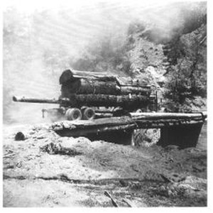 Photo, black and white: Richardson Ranch--Brown Lumber Company near Fort Ross early 1950s Warren Welsh Logging.