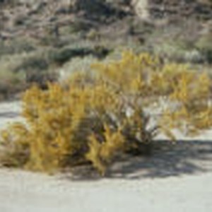 Bush of branches with yellow leaves in sand at Cottonwood Wash. Slide mount references Chrysothamnus paniculatus.