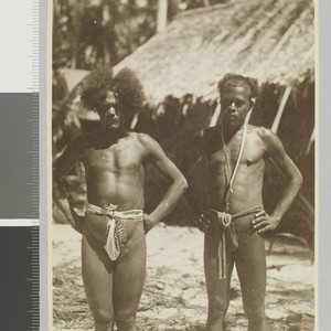 Two indigenous men in traditional attire stand posing for camera. Title transcribed from envelope. Date devised by cataloger. . Verso of photo reads: "My once young 'princes' - alas for beauty - the years. I saw Martins snaps of the boys ten years later. they made me sad."