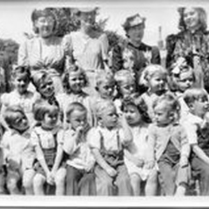 Photo--black and white: Unidentified group of Kindergarten age girls and boys with five women standing behind them. Circa 1940