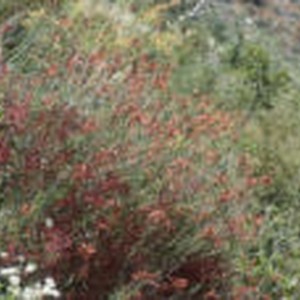Bush with small green leaves and red flowers grows at Bear Flats Trail.