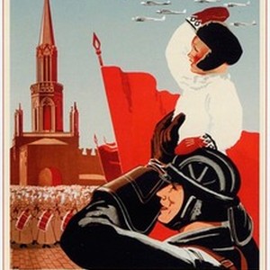A poster showing a tak crew member holding a boy on his shoulders, behind them, red banners can be seen along with Red Army soldiers, a Spasskaia Tower of Kremlin and a number of planes flying over them. [Description English/roman)]