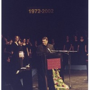 Academic dean of the Evangelical Theological Seminary on the stage of the Croatian National Theater. [Description English/roman)] Akademski dekan Evanđeoskog teološkog fakulteta drži govor na pozornici Hrvatskog narodnog kazališta. [Description (original non-English/roman language/script)]