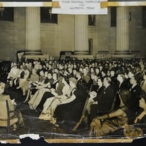 Damaged photograph of a large group of people filling the hall at the third regional conference, Church of God in Christ, Galveston, Texas, 1951. [Description English/roman)]