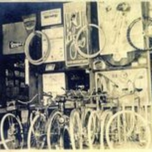 Photo--black and white: Interior of J F Triggs bicycle shop circa 1916. Located a 238 South Main Street in Sebastopol.