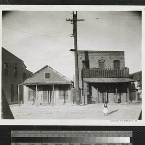 View of a one-story wooden building next to a two-story brick building with balcony on Apablasa Street in Old Chinatown, Los Angeles. There is a child in the street. Title transcribed from photograph. Note: The street name of "Apalabasa" is spelled incorrectly on the photograph, the correct spelling is "Apablasa".