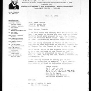 C.C. Owens (Church of God in Christ Religious Workers Guild), 3058 West Van Buren, Chicago, Illinois, letter, 1995 May 10, to Crouch, Emma, 1593 North Atoll Drive, Dallas, Texas. [Description English/roman)]