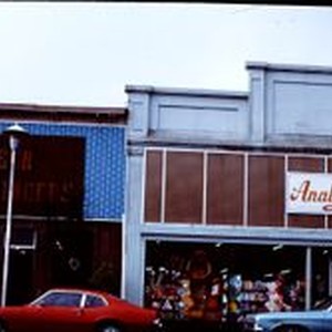Slides, Kodachrome color transparency; North Main Street Sebastopol shops: Green Fingers and Analy Bazaar, February, 1977.