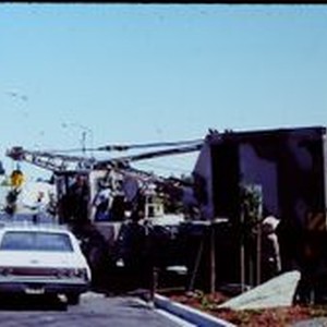 Slide, color, Kodachrome Transparency: Work putting the Pacific Fruit Express boxcar in place behind the West County Museum. The side of Frizelle Enos Feed Store can be seen at the extreme left. August, 1982