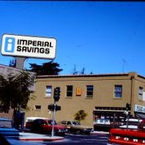 Slide, color transparency: The Imperial Savings Bank and Pease Pharmacy on the corner of Bodega Avenue and Main Street, July 1976