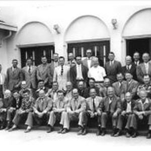 Photo--black and white: Unidentified civic group--possibly Sebastopol Rotary Club June, 1952. From L to R seated: Dr. Gail Fehrensen, Charles R. Myers, Ray Williams, Dave Collins, Dr. Chester Marsh, Don Rainey, Jack Costa, Glen McNeil, David Durst, John Spooner, Carl Shatto. L to R Middle row: Clarence Younger, Don Hallberg, Pete Hill, Lou Hart, ?, Bud Park, Bill Hotle, Hod Hotle, Delbert (Deb) Triggs, Ben Burdo, Al Duckhorn. L to R standing: ?, Lee Barlow, Howard Enos, John Wetch, Clint Carlson, Robert Rector, Ralph Thole, Jack Jacobs, Bill Williams, Dr. Horace Sharrocks, Ray Kelly, ?, ?, ? Wendell Phillips, ?.