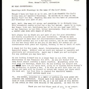 Anne L. Bailey (Church of God in Christ. Women's International Convention), 3230 Cambridge Road, Detroit, Michigan, letter, [1974], to Church of God in Christ "conventioner". Regarding the upcoming convention in San Francisco, 1975. [Description English/roman)]
