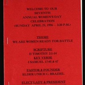 7th annual women's day program, Faith Temple Church of God in Christ, 1996 April 21. [Description English/roman)]