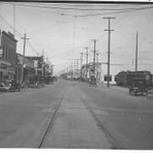 Photo--black and white: 1915 looking north on South Main Street Sebastopol at about the 200 block. A P&SR passenger car is seen to the right in front of the second automobile. The P&SR tracks down main street are seen.