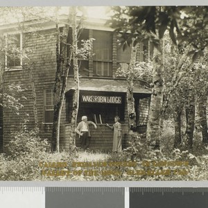 Edward Biron and Ninetta Payne stand in front of the porch of Wake Robin Lodge. Title and date devised by cataloger. Photo has been made into a postcard. Verso of photo reads: "My dear Montel - thank you - I feel much better. I am so glad that you and [Gemma?] are coming up and dear Grandpa to follow soon. You will learn to swim & have lots of fun with the children here. A big kiss for my boy Lovings Aunt Netta." Gold print on front of photo reads: " Called Trillium Covert in London's Valley of the Moon Glen Ellen Cal."