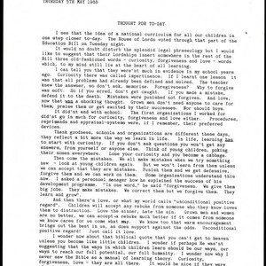 Thought for the day by Charles Handy on curiosity, adult learning, and the need for positive reinforcement and regard for adult growth and development in organizations, May 5, 1988; Charles Handy Papers; Box 18, Folder 4; 1 page