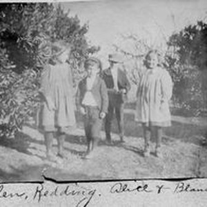 Photo--black and white: L-R: Alice Riddell, Redding Peterson, Glen Peterson and Blanche Riddell. The Peterson boys (cousins of the Riddell sisters) were children of Lock and Hattie Peterson and grandchildren of Ludencia (Sebring) and A.J. Peterson.