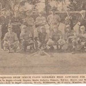 Newspaper clipping with photo, sepia: The Analy High baseball team about 1920s. Caption reads "Analy High baseball team which plays Berkeley High Saturday for Championship." Players identified, top row L-R: Coach Staples, lMudd, Roberts, Conner, Talbot, Meyer and Manager Thomas. Bottom row: Gracin, Worth, Williamson, Al collins, Winkler, McCormick.