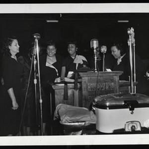 Photograph of 6 unidentified women singing at a pulpit, Church of God in Christ, [s.d.]. From Corby Bush? [Description English/roman)]