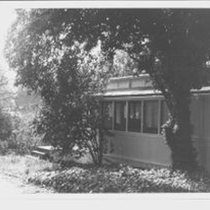 Photo--black and white: P&SR streetcar located near Analy High School that was used as a residence by Mrs. Vinnie Hampton (Christian Science Practitioner) in 1950s and 60's.