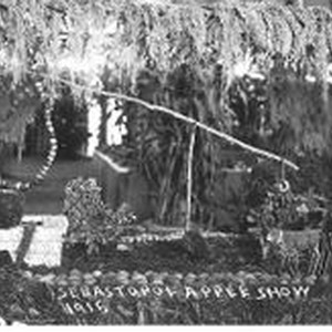 Postcard--black and white: 1915 Gravenstein Apple Show exhibit with a girl manikin at a well made of apples.