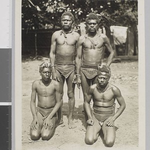 Four Ni-Vanuatu men, two standing and two kneeling, pose for camera, wearing traditional attire. Title transcribed from envelope. Date devised by cataloger. . Verso of photograph reads: "Van, New Hebrides not innocent of cannibalism."