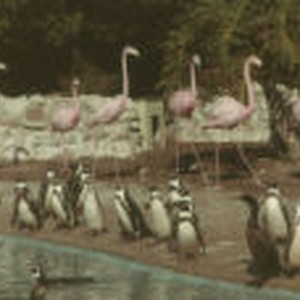 A gathering of numerous penguins and flamingos the Marineland amusement park