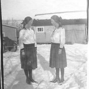 Photo--black and white: Myrtle and Mildred Kingwell in the snow circa 1923. Mildred and Myrtle are the twin daughters of Ben Rowe Kingwell and his wife Josephine (Jessie) Beedle Kingwell.