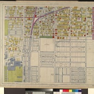 WPA Land use survey map for the City of Los Angeles, book 8 (Downtown Los Angeles and Hyde Park to Watts District), sheet 33. Includes: [Title page and] legend [for Book] no. VIII Composite index to Land use map books [for Book 8] Index to Book no. 8. Land use survey - City of Los Angeles. Department of City Planning. These maps were prepared with the assistance of the Works Progress Administration project no. 665-07-G-226 through 1939 to 1940. The land use data contained herein was compiled from a survey made with the assistance of the Civil Works Administration project no. 642, State Emergency Relief Administration project nos. 1-F2-318 and 1-F2-318A and Works Progress Administration project nos. 65-3-4377, 1101-2011 and 465-03-3-106. This survey functioned from Dec. 18, 1933 to May 8, 1939 and covers approximately 460 square miles within the boundary of the City of Los Angeles. It includes 347 colored drawings bound in 10 volumes of which this is no. VIII. The land use survey was supervised by the Zoning Engineer. The land use maps were supervised by the Illustrative Planning Engineer for the Sponsoring Department.