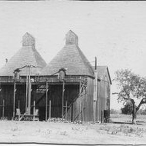 Photo--sepia: A hop kiln circa 1918. The hop kiln was used to dry and prepare hops for beer production. Hop growing was a prominent crop in Sonoma County from the early 1900s to about 1940.