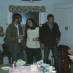 Dave Powelson, Chip Hogue, Terri Hoban, and Lee Doering celebrating at a senior party for Pomona College students.