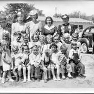 Photo--black and white: Unidentified group of Kindergarten age girls and boys with five women standing behind them. Circa 1940