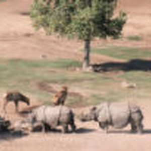 Two rhinoceroses standing near a trough with other animals nearby.