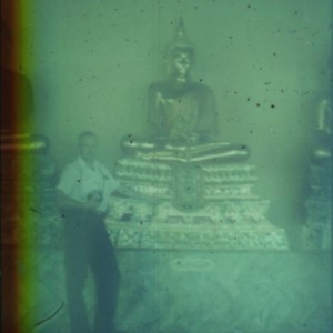 Image / Unidentified man standing next to golden Buddha statue
