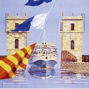 Soviet poster dedicated to V.I. Lenin Volga-Baltic Waterway. Caption reads, "Волго-Балтийский водный путь им. В.И. Ленина / Volgo-Baltiiskii vodnyi put' im. V.I. Lenina", meaning, "V.I. Lenin Volga-Baltic Waterway". [Description English/roman)]