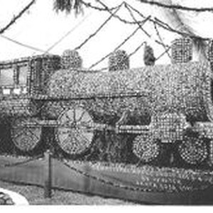 Postcard--black and white: A 1914 Gravenstein Apple Show exhibit of a train engine made of apples. Handwritten caption: "Sebastopol Apple Show Aug 3-9-14 By Walter Santa Rosa Cal."