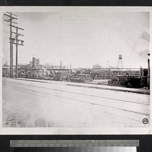 View of a storage yard with pipes and tiles of the Gladding McBean ceramics company on Date Street near Old Chinatown in Los Angeles. Title transcribed from photograph; title on item very faded.
