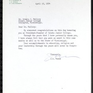 J.W. Moses, Lexington, Mississippi, letter, 1974 April 19, to Arenia C. Mallory (Saints College), Lexington, Mississippi. "My sincerest congratulations on this day..." [Description English/roman)]