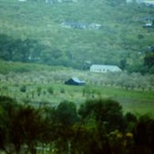 Slide, color transparency: Apple orchards in bloom on Barnett Valley Road, 1983.
