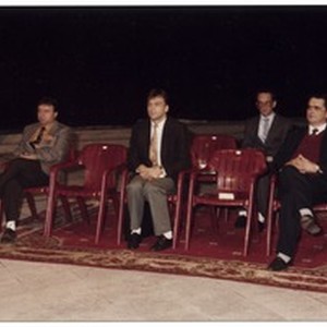 A photograph of Mihael Kuzmič and three other men sitting on red plastic chairs. [Description English/roman)] Fotografija Mihaela Kuzmiča i trojice muškaraca kako sjede na crvenim plastičnim stolicama. [Description (original non-English/roman language/script)]