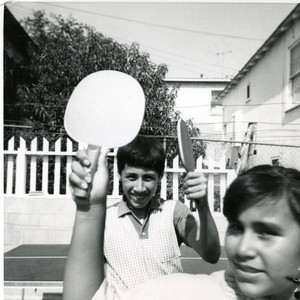 Siblings Phillip (left) and Susan Martinez (right) display their paddles for a game of table tennis in their backyard in City Terrace, Spring 1966.