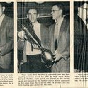1962 newspaper clipping with photos of Analy High School football players receiving trophies by coaches. L-R: Skip Marshman and unidentified backfield coach; center: Rick Hardina and coach Wally Barnard; Right: Steve Buffman and coach Adolf Bertoli.