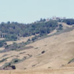 Dry brown grass and dark green trees lead up a hillside to the Hearst Castle.